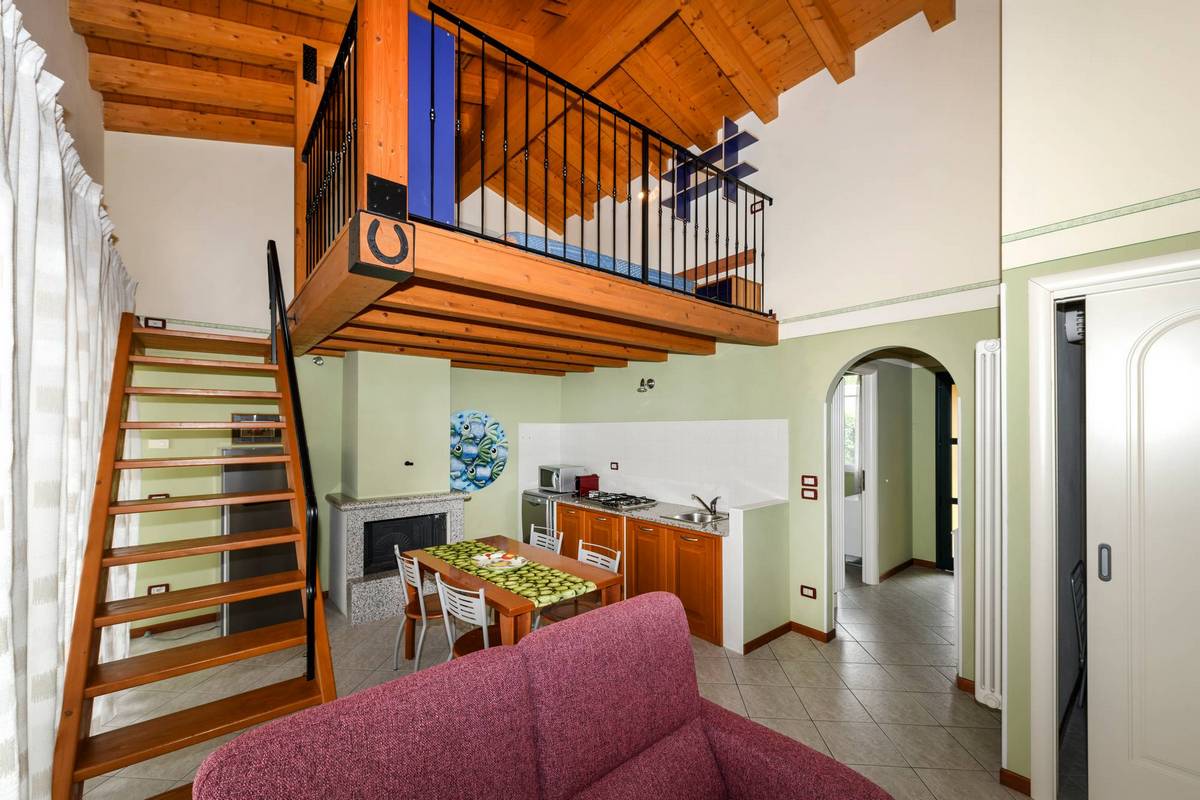 I trilocali con soppalco, anch’essi capienza 2+1, rappresentano una soluzione originale e funzionale per chi desidera spazi più ampi ed articolati. L’appartamento si sviluppa su due livelli: al piano principale si trova la zona giorno con cucina attrezzata, il soggiorno con accesso diretto alla terrazza vista lago, uno spazio lavanderia, una camera nella zona notte, un ampio e luminoso bagno. Il soppalco, raggiungibile tramite una scala interna, ospita una seconda camera in ambiente intimo e raccolto regalando una suggestiva panoramica.