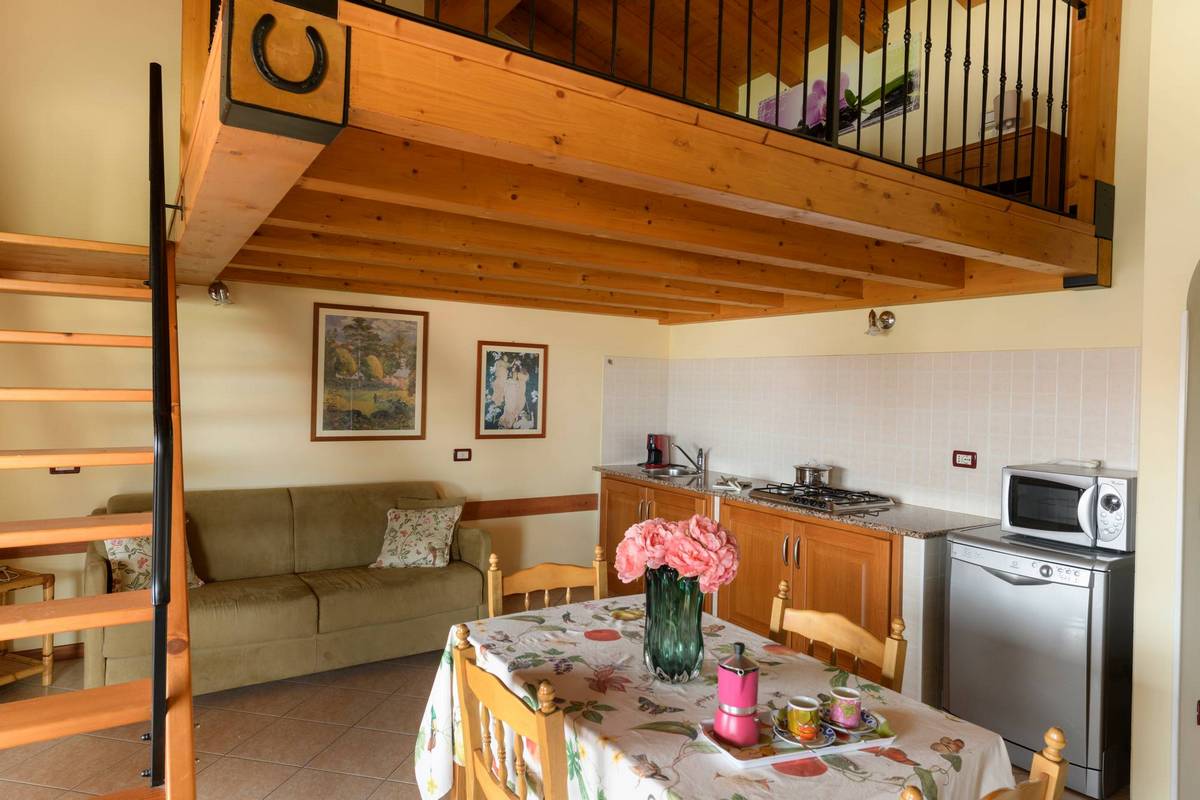 I bilocali del Casale el Galet sono la soluzione perfetta per coppie e piccolo nuclei familiari in cerca di comfort e tranquillità. Ogni appartamento è composto da un'ampia zona giorno con cucina completamente attrezzata e un accogliente soggiorno che si apre sulla veranda panoramica con vista lago. La camera matrimoniale, separata e riservata, garantisce il massimo della privacy. Gli ambienti luminosi e le finiture moderne rendono ogni soggiorno un'esperienza di relax immersi nella bellezza della Valtenesi.